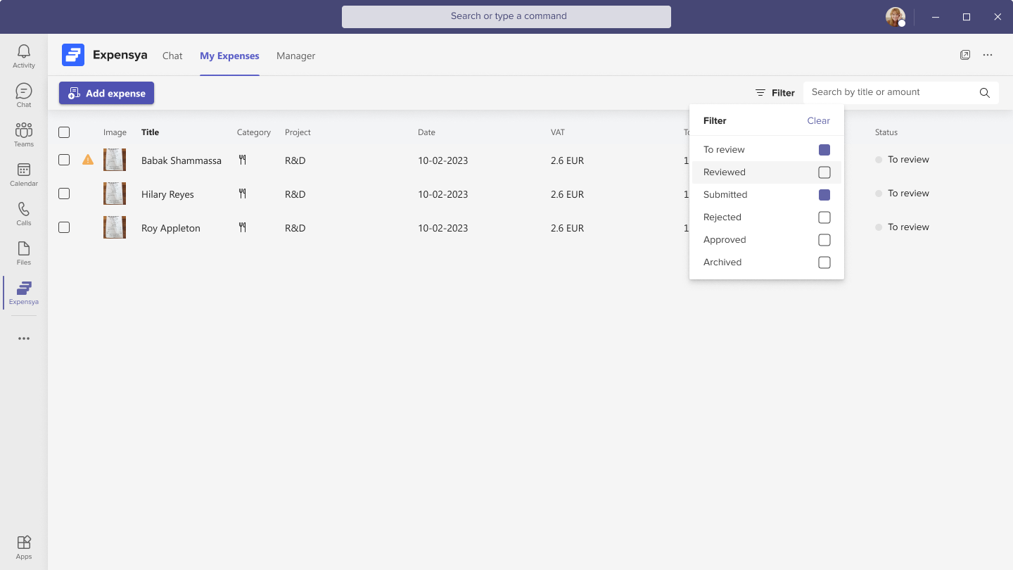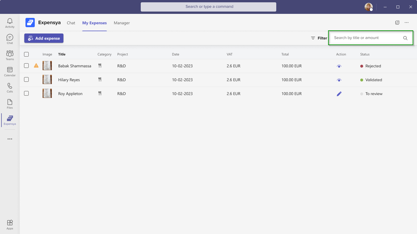 Note: Expenses added from Teams are also accessible on other Expensya platforms (Web and Mobile).