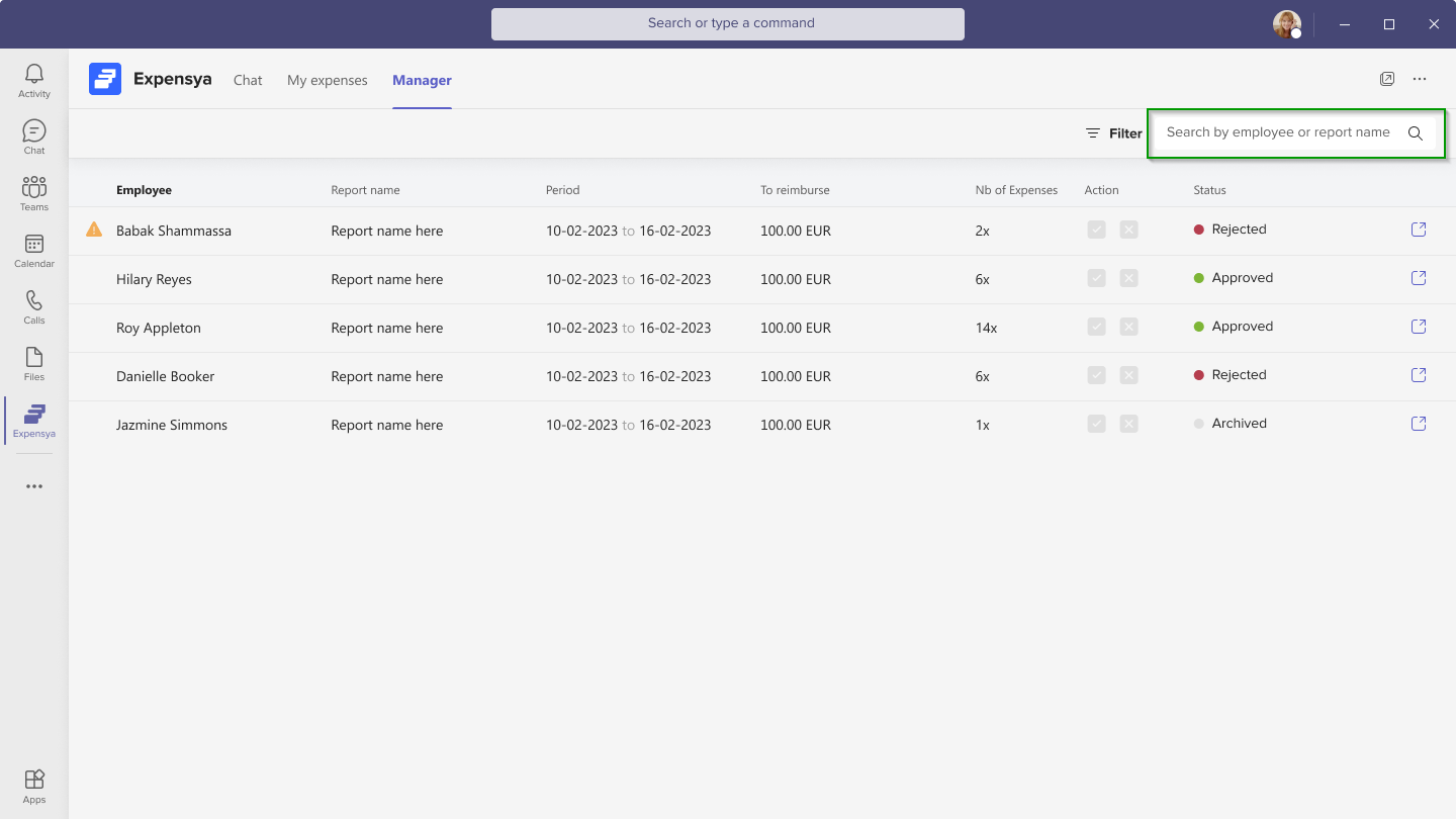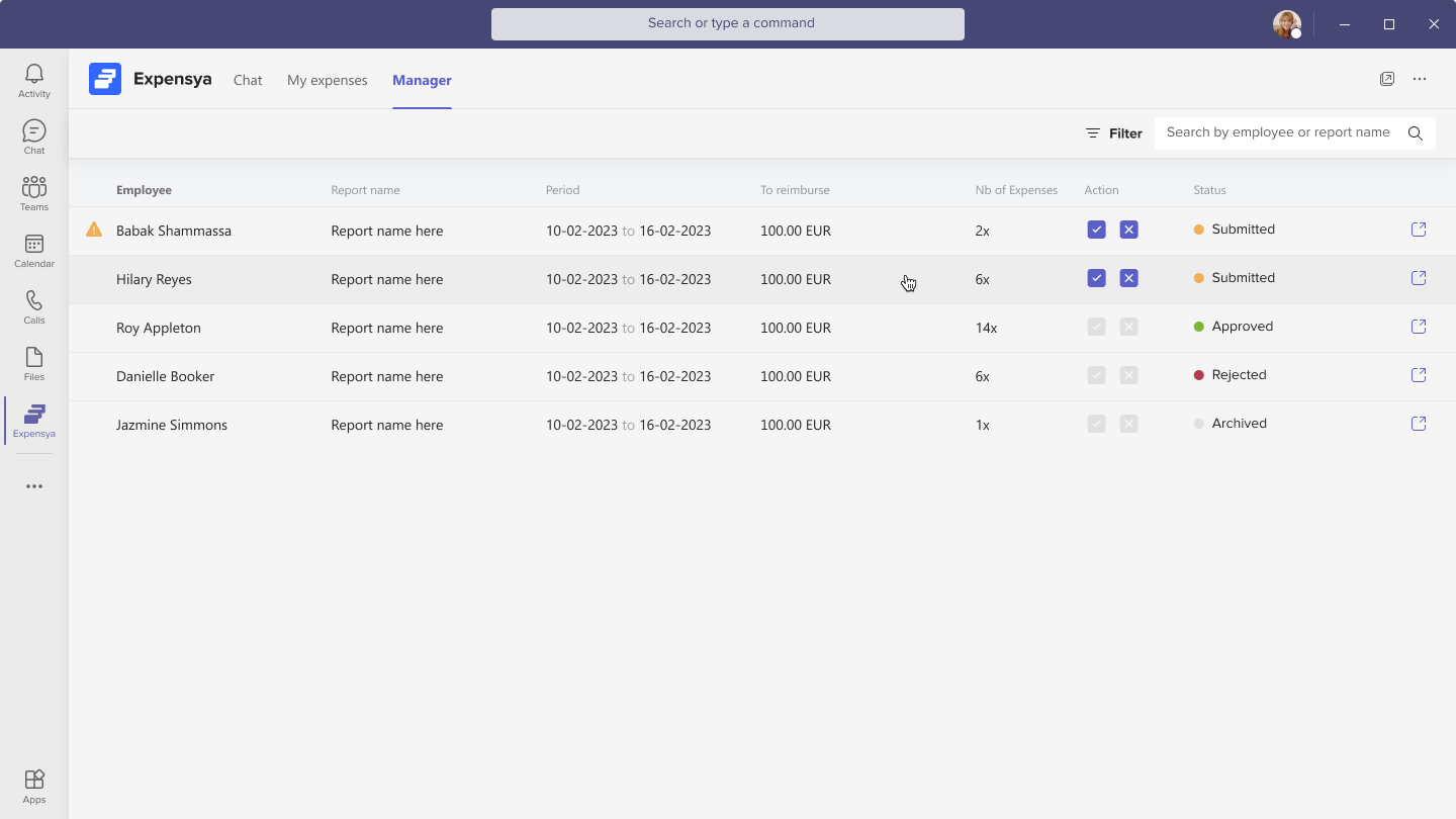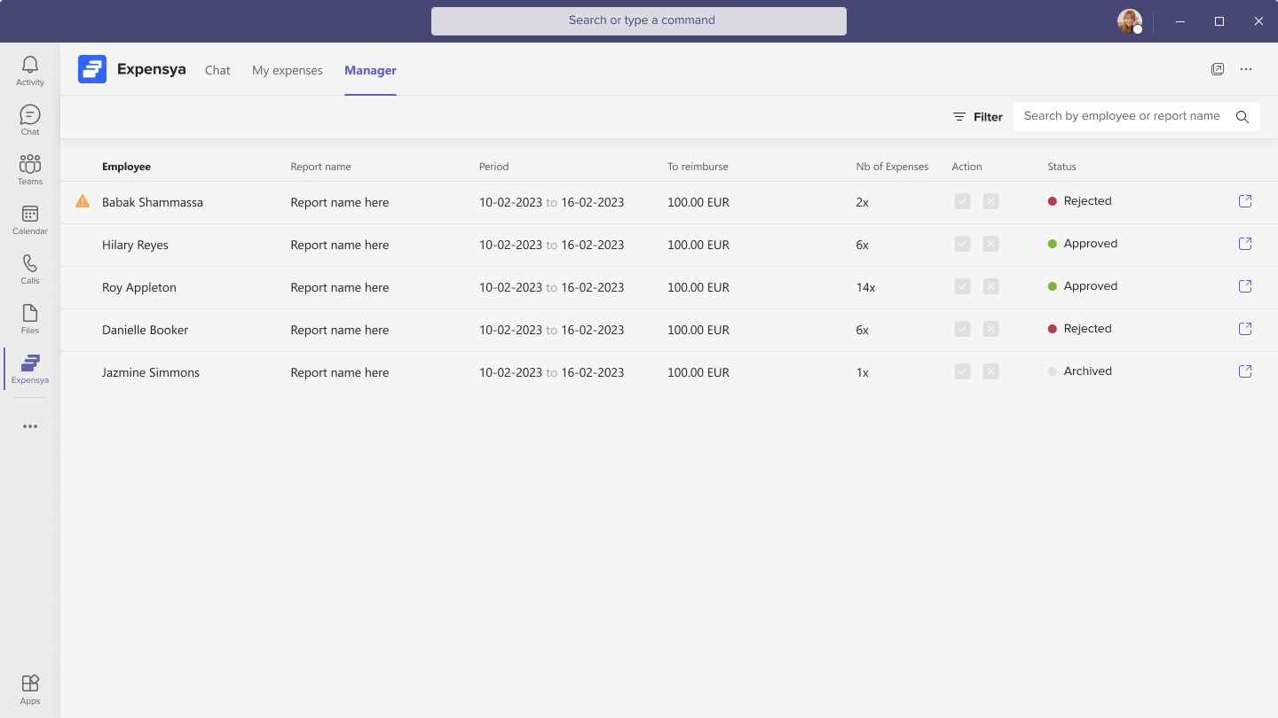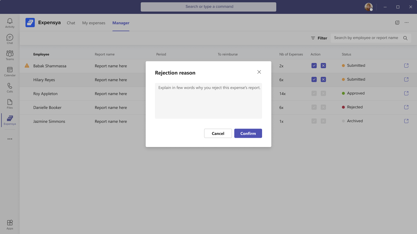 - Approve / Reject Expense Reports as a Manager from Teams Conversations: As a manager using the Expensya application within Teams, you can easily approve or reject expense reports directly from the conversation interface. This provides a convenient way to manage your team's expense reports within Microsoft Teams.