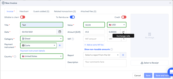 As an administrator, you have the possibility to activate an option that allows end users to modify the exchange rate from the expense form.