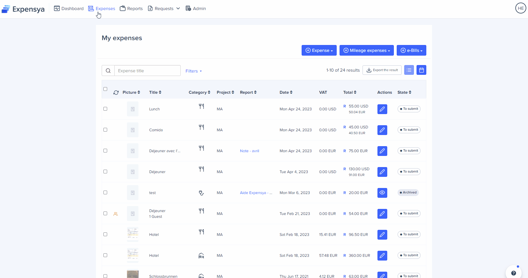 When an employee makes an expense abroad, with a currency other than the one configured in his account, the amount is displayed in both currencies, with the exchange rate calculated as explained above.