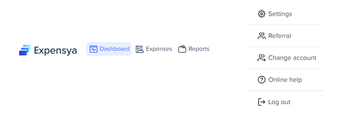 The navigation panel facilitates the access to various features of Expensya, allowing you to effectively manage your expenses,reports, and other account-related settings. It includes the following options:
