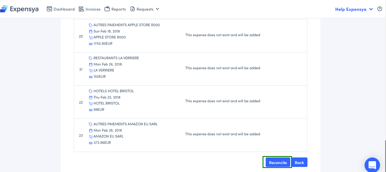 Then you will see a summary table showing the lines that exist in the bank statement and the expenses that exist in Expensya enabling you to reconcile them.