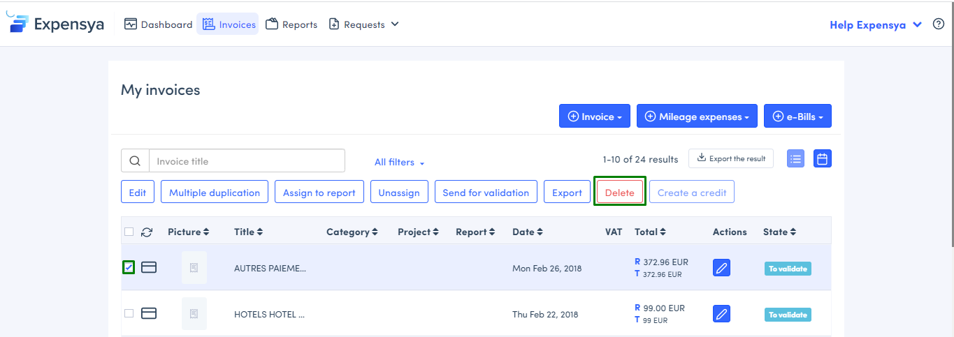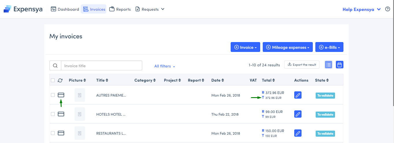 Once this step is complete, your expenses will be created in Expensya with the credit card icon and the T for the transaction. This enables you to differentiate between expenses originating from the bank statement and expenses you created previously.