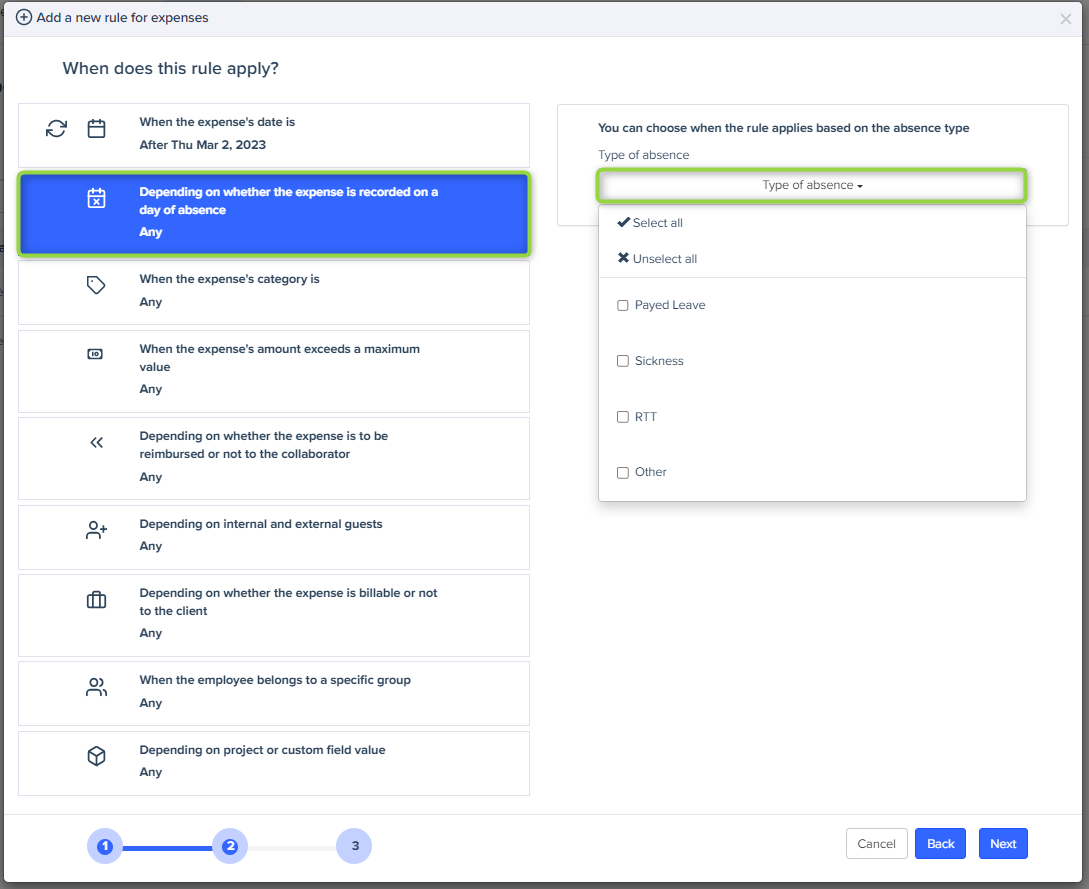 - Click on Depending on whether the expense is recorded on a day of absence.