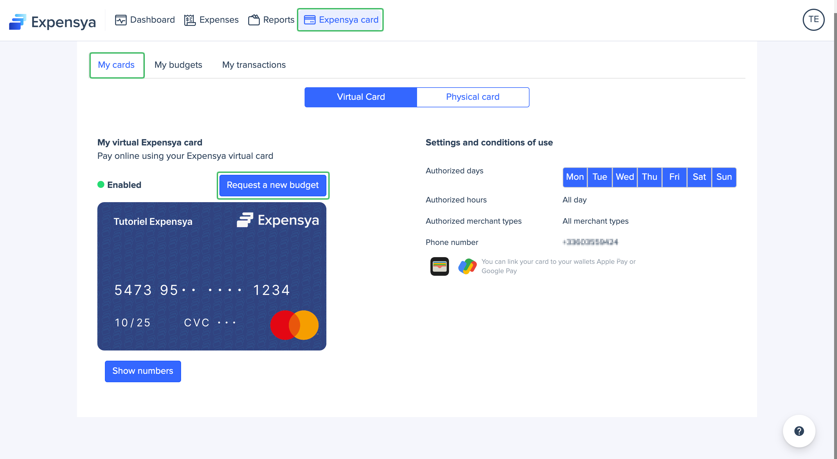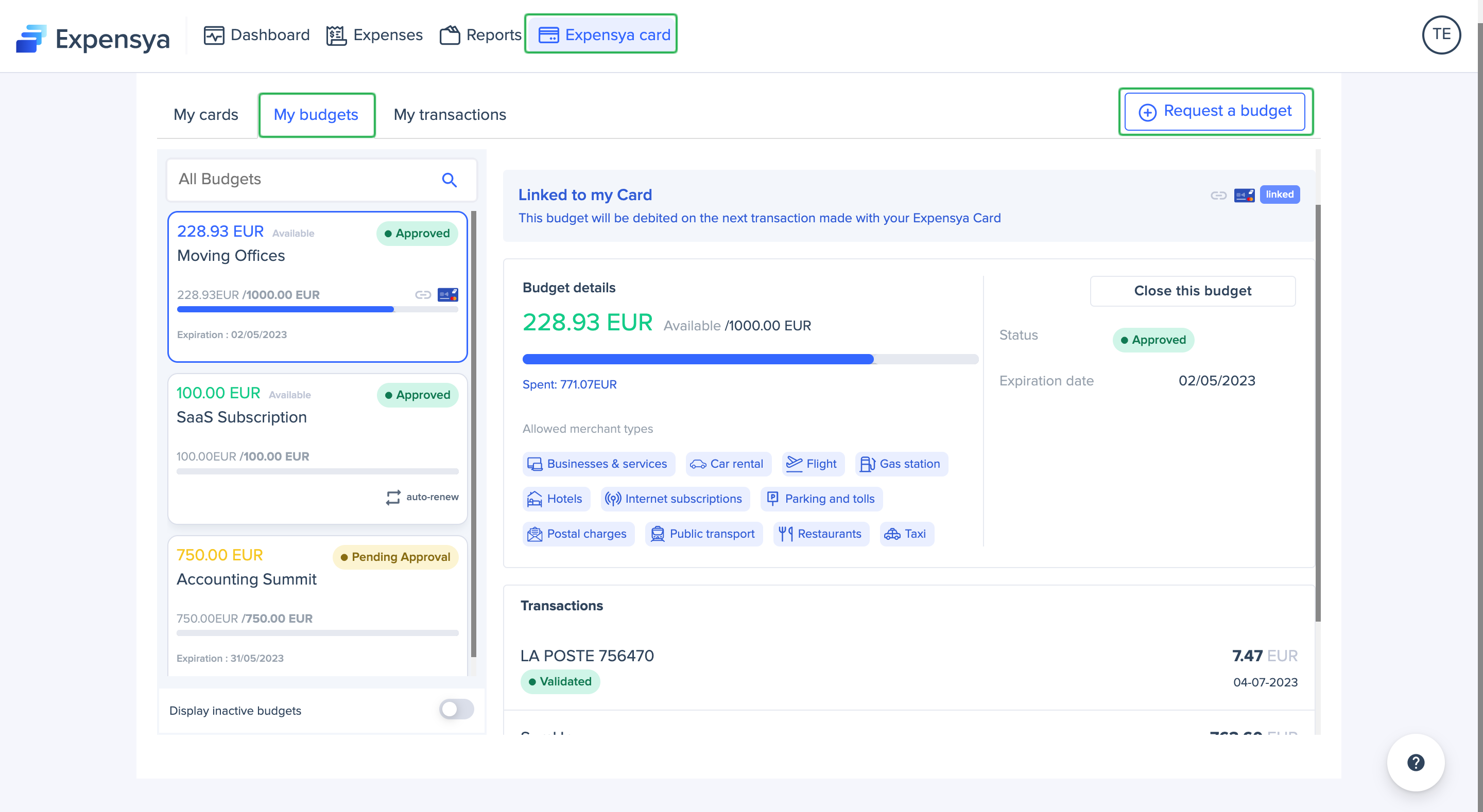 To utilize your Expensya card, it is imperative to request a budget and obtain approval before initiating any purchases.