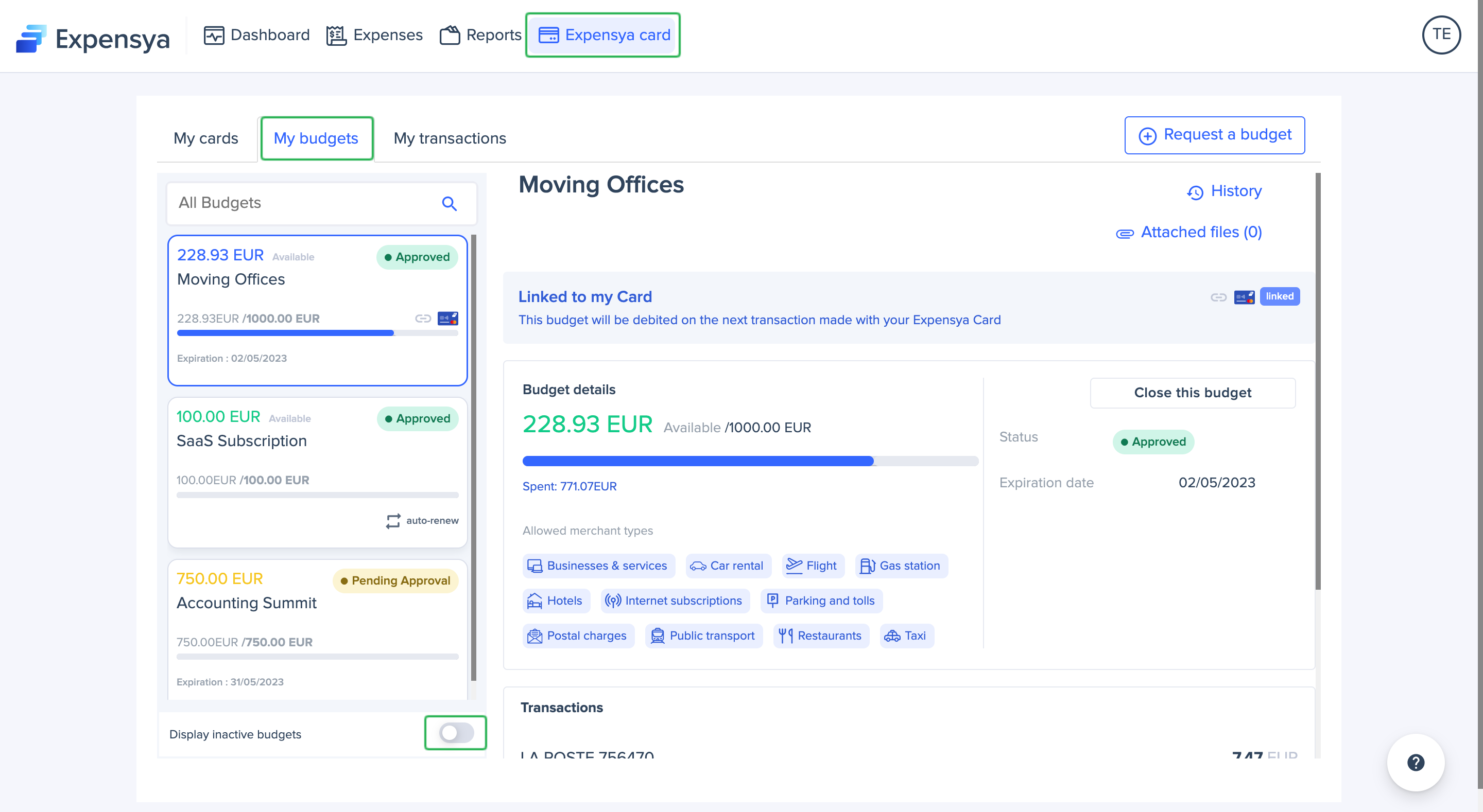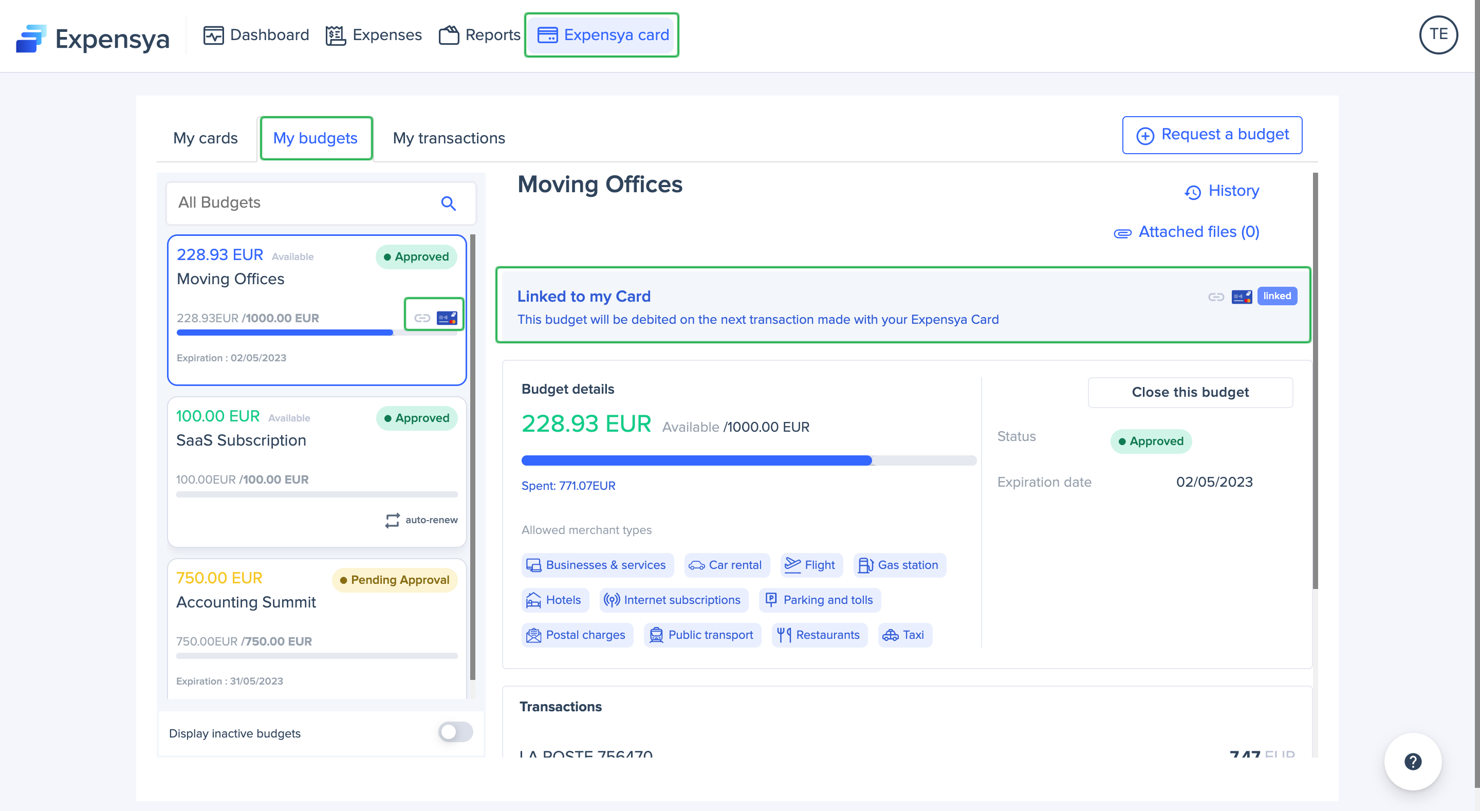 It is important to note that only one budget can be linked to a card at a time. When you pay for an expense using your Expensya Card, the transaction will be recorded with the budget linked to the that card. A single budget prevents confusion and ensure that all expenses are recorded accurately under the appropriate budget. Which will make spending and transactions reviews easier to track. If you have a virtual and a physical card, both will be linked to the same budget.