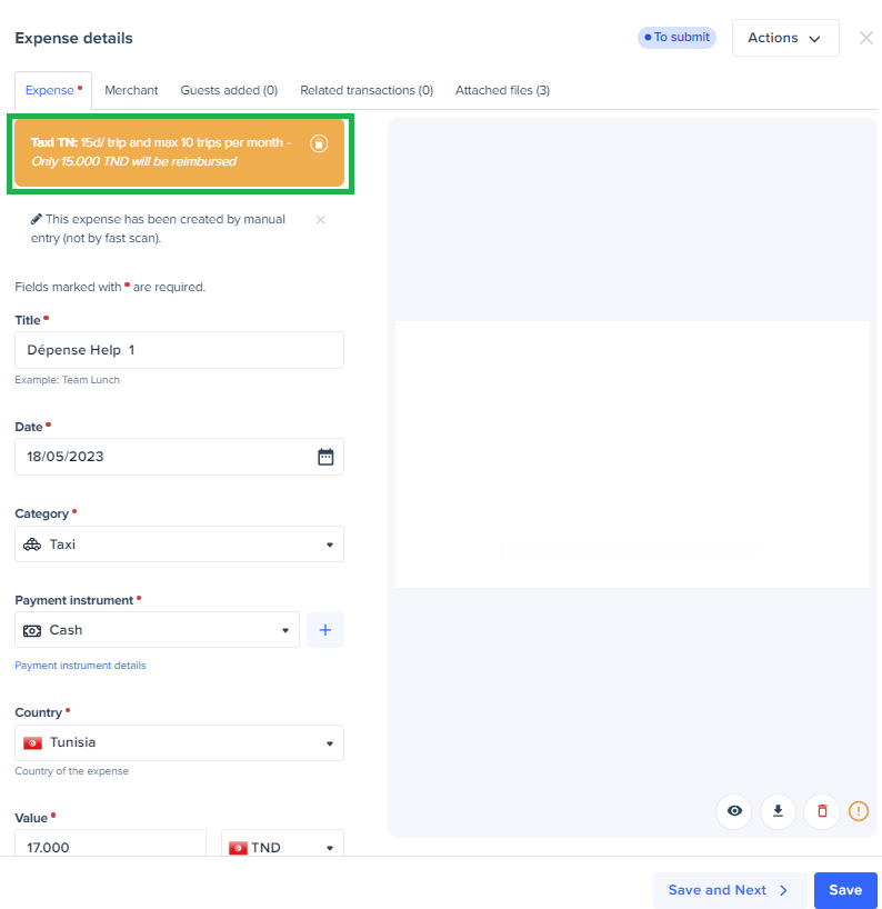 Expensya issues an alert for upward modifications of impactful numbers (e.g., distance traveled, expense amount, currency conversion rate). Additionally, a color-coded alert appears when the VAT rate is not in line with the expense amount.