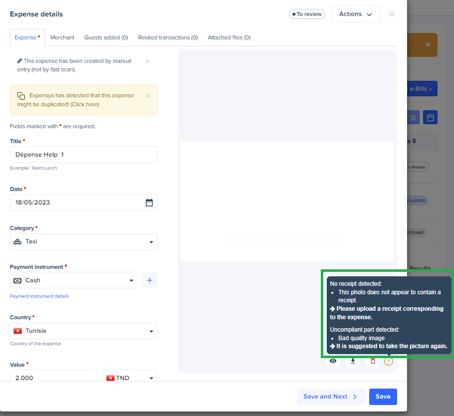Expensya allows verification of image quality and displays a warning in the expense list. If the image quality is insufficient (e.g., blurred), a warning is sent to both the employee and the approver.