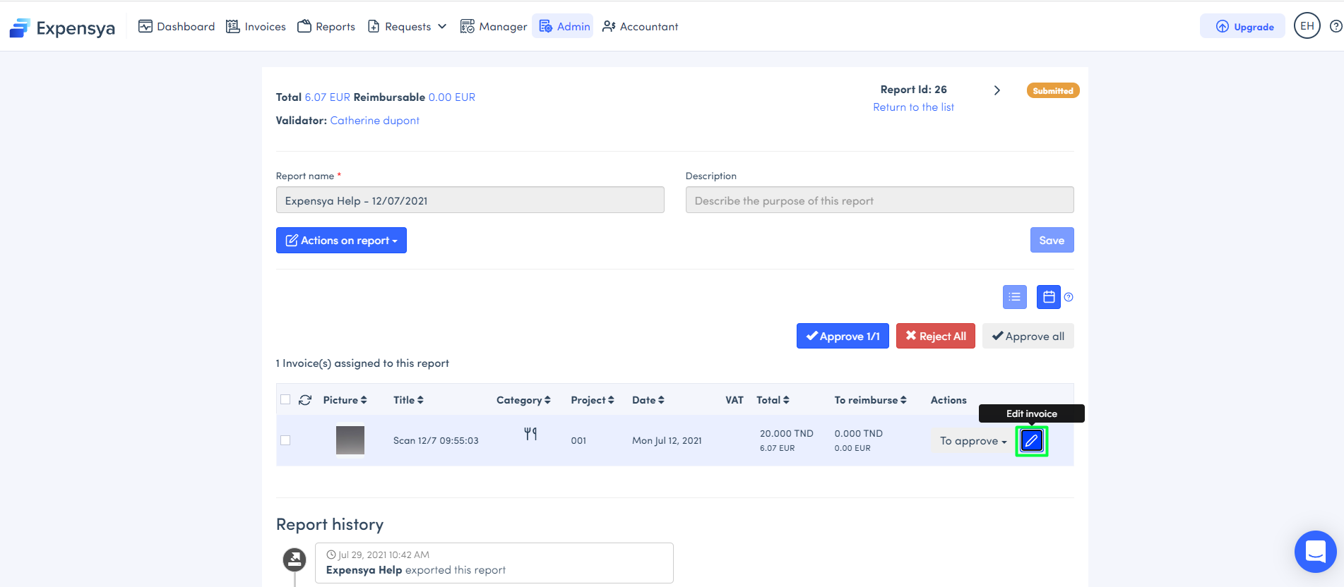 The Expensya website enables you to modify your team's expenses if you are their first approver, additional approver, accountant, or administrator.