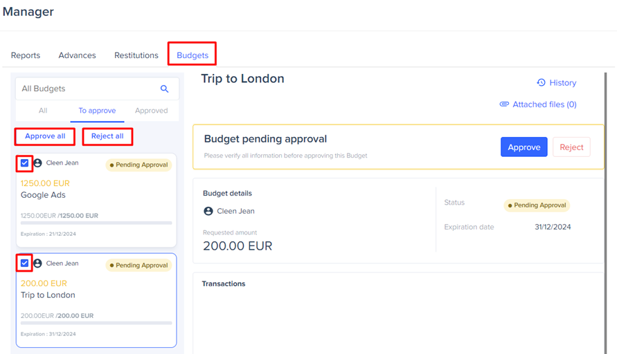 - Click on the approve button to approve one budget from the listed budgets awaiting approval or select multiple budgets and click on approve all to approve all of them at the same time.